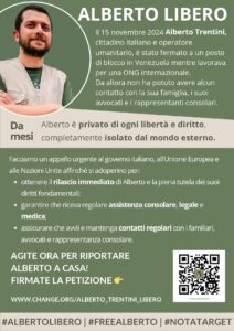 Giorgia Meloni è una madre. E lo sa. Comprendo la complessità della situazione, ma mi aspetto che il nostro paese prenda le decisioni urgenti e necessarie per riportare Alberto a casa nel più breve tempo possibile. Alberto è un cittadino italiano, un operatore umanitario che si trovava in Venezuela per svolgere con professionalità e dedizione il suo lavoro. Un’attività che, oltre a portare aiuto concreto, rappresenta uno degli strumenti più importanti nelle relazioni internazionali per costruire ponti di solidarietà e cooperazione tra i Paesi. Dopo questi 100 giorni, sono con il cuore in mano a chiedere a ciascuno di fare tutto il necessario, con la massima urgenza, affinché Alberto possa tornare a casa prima che questa esperienza segni irrimediabilmente la sua vita nel corpo, nella mente e nello spirito. Lui è il nostro unico figlio la nostra ragione di vita. Con speranza e fiducia.