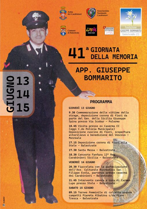 La Fondazione Giuseppe Bommarito contro le mafie vi invita a partecipare agli eventi organizzati per il 41esimo anniversario della strage di Via Scobar a Palermo, dove il 13 giugno 1983 il capitano dell’Arma dei Carabinieri Mario D’Aleo, l’appuntato Giuseppe Bommarito e il carabiniere scelto Pietro Morici furono uccisi in un agguato teso loro dai killer mafiosi.
