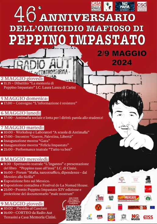Pubblichiamo il programma provvisorio delle giornate che vanno dal 2 al 9 Maggio per il 46esimo anniversario dell’omicidio mafioso di Peppino Impastato.