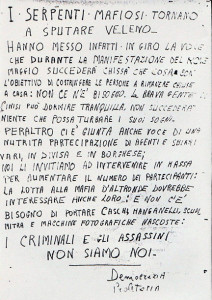 Mi assumo il compito di stare alla radio tutta la giornata. Scrivo col pennarello un messaggio da esporre a Cinisi e lo leggo in trasmissione: “Qui Radio Aut. I serpenti mafiosi tornano a sputare veleno. Hanno messo in giro la voce che durante la manifestazione succederà qualcosa per spaventare la gente e farla restare chiusa in casa. La brava gente di Cinisi può dormire tranquilla, non succederà niente che possa turbare i suoi sogni. Ringraziamo le forze dell’ordine, in borghese e in divisa, per la loro nutrita partecipazione. Così al corteo saremo di più. E non c’è bisogno di portare caschi, manganelli, scudi, mitra e macchine fotografiche nascoste. I criminali e gli assassini non siamo noi”.