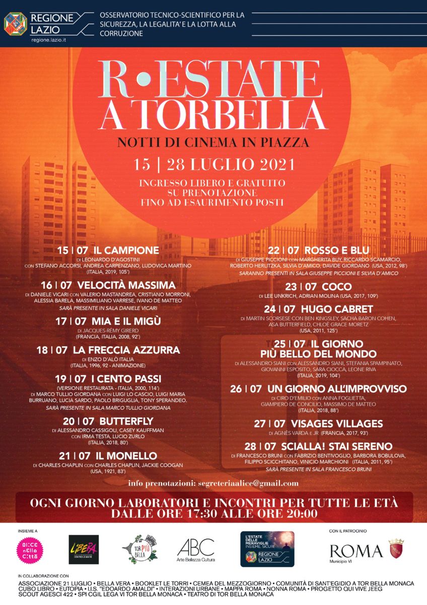 Dal 15 al 28 luglio torna nella location di Piazza Castano, a Roma per il terzo anno consecutivo R-Estate a Torbella – Notti di cinema in piazza, l’arena cinematografica gratuita all’aperto promossa dall’Osservatorio per la Legalità e la Sicurezza insieme ad Alice nella città, che cura la direzione artistica della manifestazione, Libera, Tor Più Bella, ABC Arte Bellezza e Cultura. L’iniziativa è patrocinata dal Municipio VI di Roma Capitale.