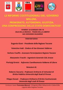 Il primo incontro di questo ciclo si terrà venerdì 24 gennaio, alle 18 alla sala della musica di San Giovanni Valdarno, e si concentrerà sugli aspetti giuridici e politici delle varie riforme e in particolare sulla legge per l’autonomia differenziata.