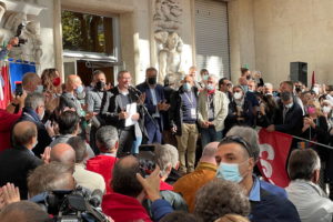 Bandiere, pugni chiusi, qualche lacrima. E testa alta, altissima. Mentre il segretario generale Landini davanti la sede ferita, scalda una tiepida domenica d’autunno: “Non ci intimidiscono, non ci fanno paura”.