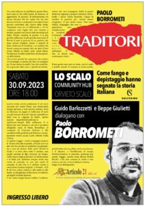 Dopo il primo incontro a San Venanzo in occasione del pronunciamento della Consulta in merito al processo aperto sull’ uccisione di Giulio Regeni, sabato 30 settembre alle 18 a “Lo Scalo” Community Hub”di Orvieto Scalo verrà presentato “Traditori”, il libro del giornalista Paolo Borrometi che da sette anni vive sotto scorta per le minacce ricevute da associazioni di stampo mafioso.