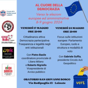 Crediamo sia fondamentale incentivare il confronto intorno al “bene pubblico” e, date le prossime ricorrenze di fondamentale importanza, abbiamo organizzato, su proposta e con il Circolo Acli Achille Grandi di Lainate, due serate che toccheranno i temi della cittadinanza attiva, della democrazia partecipativa, dei meccanismi di controllo e monitoraggio dell’operato delle amministrazioni locali nel prevenire e contrastare fenomeni di corruzione e illegalità e del funzionamento del Parlamento Europeo e delle modalità di voto.