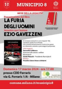 Per il Mese della Legalità del Municipio 8, è in programma la presentazione del libro “La furia degli uomini” di Ezio Gavazzeni. L’incontro, proposto e organizzato dall’Associaizone Peppino Impastato e Adriana Castelli con cui abbiamo avuto il piacere di stringere una buona collaborazione, verrà moderato dal nostro presidio.
