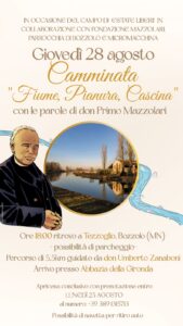 A seguire nel tardo pomeriggio di giovedì 28 agosto don Umberto Zanaboni, Vicepostulatore della Causa di beatificazione di don Mazzolari, guiderà la camminata “Fiume, Pianura, Cascina” che si snoderà per 5,5 km nel territorio del Parco Oglio Sud. Il ritrovo è fissato alle ore 18 in località Tezzoglio e l’arrivo sarà presso l’Abbazia della Gironda con apericena su prenotazione al n° 3891315713. Si segna la possibilità di navetta per il ritiro dell’auto.
