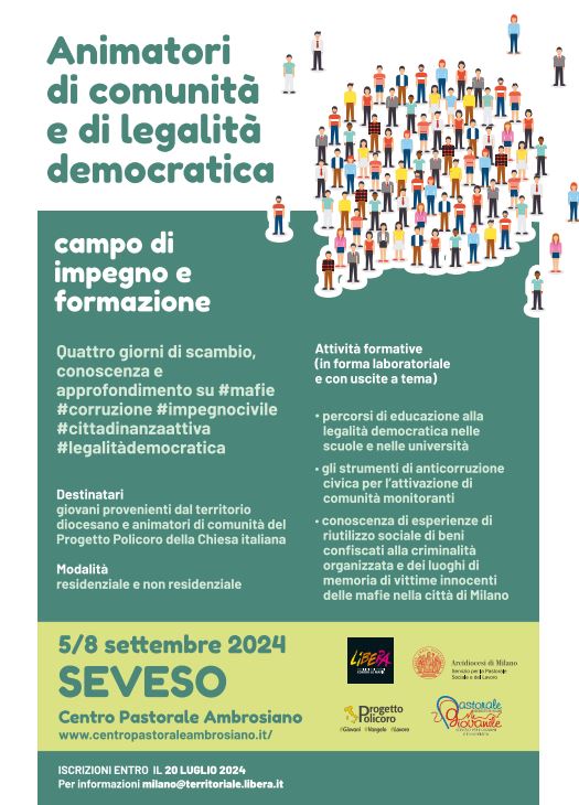 Dal 5 all’8 settembre 2024, presso il Centro pastorale ambrosiano di Seveso (MB), si svolgeranno quattro giorni di scambio, conoscenza e approfondimento su mafie, corruzione, impegno civile, cittadinanza attiva, legalità democratica. Iscrizioni fino al 20 luglio.