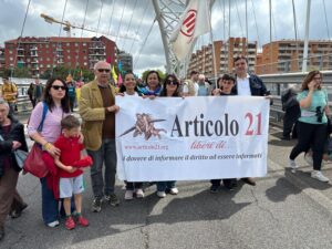 “Essere qui significa per noi ribadire il valore della democrazia e della libertà di espressione riconquistata dopo il durissimo regime fascista da cui siamo stati liberati il 25 aprile di 80 anni fa”, ha sottolineato la delegazione di Articolo 21.