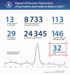 In 2021, 113 journalists were arrested in Belarus just for doing their job. 32 are still in detention. In the same year, 146 journalists’ homes and editorial offices were searched, 13 media outlets were officially labelled as extremist, and the only independent organisation representing journalists, BAJ, was dissolved by the regime of Belarusian dictator Alexander Lukashenko.