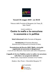 L’appuntamento è per venerdì 24 maggio, alle ore 20,45 presso la Sala Viterbi del Palazzo della Provincia di Bergamo (via Tasso, 8), con l’incontro pubblico “Contro le mafie e la corruzione in economia e in politica”.