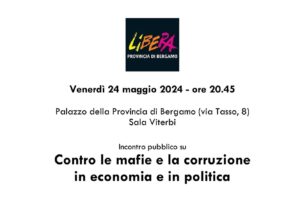 L’appuntamento è per venerdì 24 maggio, alle ore 20,45 presso la Sala Viterbi del Palazzo della Provincia di Bergamo (via Tasso, 8), con l’incontro pubblico “Contro le mafie e la corruzione in economia e in politica”.