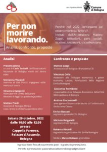 “Cosa dobbiamo fare?” lo chiederemo, aiutati dal giornalista Marco Bettazzi, a Matteo Zuppi presidente CEI, Vincenzo Colla Assessore regionale al Lavoro, Giovanna Trombetti responsabile Area Sviluppo Economico della Città Metropolitana di Bologna, Andrea Giacominelli Confindustria Bologna, Enrico Bassani CISL Bologna, Michele Bulgarelli FIOM Bologna, Roberto Rinaldi UIL Bologna.