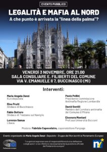 Venerdì 3 novembre 2023 alle ore 21.00 presso la Sala Consiliare del Comune di Buccinasco (Milano), in via Vittorio Emanuele II, si tiene l’incontro pubblico dal titolo “Legalità e mafia al nord: a che punto è arrivata la linea della palma?”, organizzato dalla deputata europea Maria Angela Danzì.