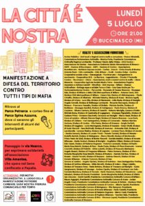 Il prossimo 5 luglio alle ore 21 insieme ad Avviso Pubblico. Enti locali e Regioni contro mafie e corruzione, U.c.a.p.te – Associazione “Una Casa Anche Per TE” e @descargaLab, saremo promotori insieme alla rete delle realtà di una manifestazione che si concentrerà al “Parco Petrarca” di Buccinasco dal quale partirà un corteo fino al Parco Spina Azzurra, dove ci saranno gli interventi di alcuni dei partecipanti.