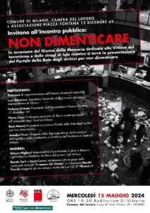 Mercoledì 15 maggio, alle ore 10.30, presso la Camera del Lavoro di Milano in corso di Porta Vittoria, si terrà l’incontro pubblico “Non dimenticare”, in occasione della ricorrenza del “Giorno della Memoria dedicato alle Vittime del terrorismo e delle stragi di tale matrice”.