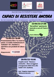 Al via dal 13 al 29 maggio a Mantova la rassegna di eventi sulla legalità “Capaci di resistere ancora”, promossa da Libera, Osservatorio permanente sulla Legalità del Comune di Mantova e Avviso Pubblico.