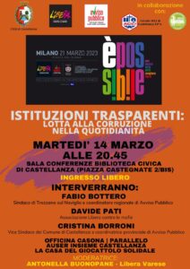 Nel percorso verso il 21 Marzo 2023 si inserisce la serata che si terrà il martedì 14 marzo alle ore 20.45 presso la sala conferenze della Biblioteca Civica di Castellanza in piazza Castegnate 2bis (con ingresso libero) che ha come titolo “Istituzioni trasparenti: lotta alla corruzione nella quotidianità”, e che rappresenta un momento di approfondimento e riflessione sulle tematiche della legalità e della lotta alla mafia.