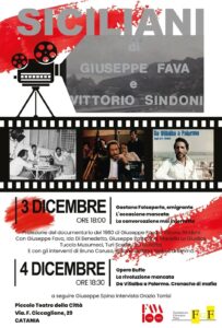 Mercoledì 3 e giovedì 4 dicembre, nell’ambito del Centenario della nascita di Giuseppe Fava, al Piccolo Teatro della Città (Catania, via Ciccaglione, 29) sarà proiettato il docu-film i SICILIANI di Giuseppe Fava e Vittorio Sindoni, con Giuseppe Fava, Ida Di Benedetto, Giuseppe Pattavina, Mariella Lo Giudice, Tuccio Musumeci, Turi Scalia, Leo Gullotta. E con gli interventi di Bruno Caruso, Ignazio Buttitta, Nello Caramma.