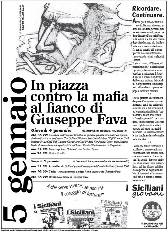 Anche quest’anno i cittadini onesti sfileranno al corteo, indetto dai Siciliani giovani e altre associazioni democratiche, per ricordare Giuseppe Fava e riaffermare la fedeltà alle sue idee.