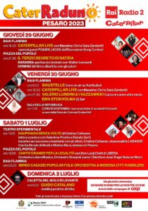 Appuntamento dal 29 giugno al 2 luglio con il CaterRaduno 2023, che ogni anno torna a rallegrare la città di Pesaro e il territorio con un mix collaudato di musica (in programma anche il concerto dei Modena City Ramblers), parole (tra cui quelle che fanno attivarsi e impegnarsi di Don Luigi Ciotti e quelle che fanno riflettere e sorridere di Valerio Lundini) ed eventi, in perfetto stile radiofonico e con le voci di Massimo Cirri e Sara Zambotti.