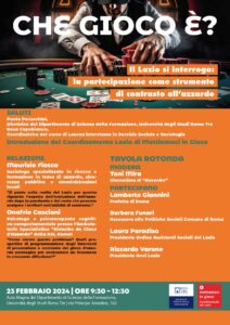 Venerdì 23 febbraio, dalle ore 9.30 alle ore 12.30, presso l’Aula Magna del Dipartimento Scienze della Formazione di Roma 3, in via Principe Amedeo, 182b, si svolgerà il convegno “Che gioco è? Il Lazio si interroga: la partecipazione come strumento di contrasto all’azzardo”.