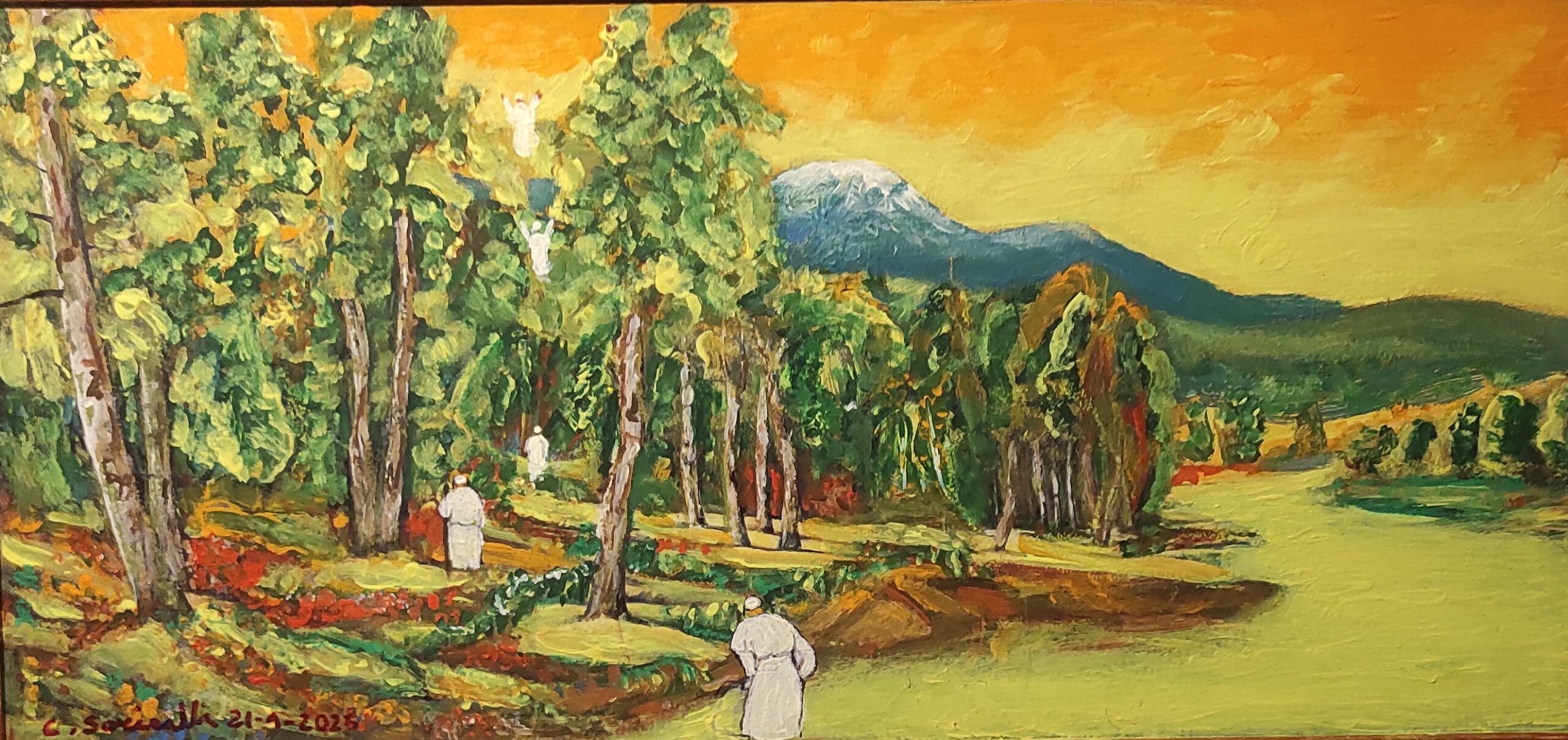 Quando abbiamo saputo della tua morte stavo dipingendo un paesaggio pranico molto bello, la natura vista dal punto dell’energia invisibile che ci circonda: una natura che hai sempre cercato di proteggere denunciando la violenza su di essa di noi umani. Allora ti ho inserito nell’opera: cammini sempre più piccolo per poi andare in Cielo.