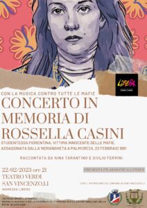 Il nostro Presidio di Libera quest’anno invita tutta la cittadinanza a ricordare Rossella partecipando al Concerto che la Filarmonica Giuseppe Verdi, accogliendo la proposta fattale da Libera, terrà mercoledì 22 febbraio, alle ore 21, al Teatro Verdi di San Vincenzo, con la direzione del Maestro Alessio Barsotti.