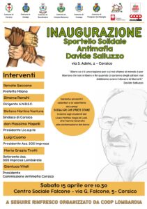 Verrà inaugurato sabato 15 aprile a Corsico, in provincia di Milano, lo “Sportello solidale antimafia Davide Saluzzo”, aperto nei locali di via Sant’Adele 2 che furono confiscati alla criminalità organizzata e che la scorsa estate sono stati riqualificati dai volontari dei campi “Scegli da che parte stare”.