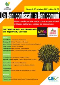 L’appuntamento è con Avviso Pubblico e Libera per venerdì 20 Ottobre 2023 dalle 16.00 alle 19.00, presso la Cittadella del Volontariato, Via degli Stadi, a Cosenza con l’incontro “Da beni confiscati a beni comuni. I beni confiscati alle mafie come opportunità di sviluppo culturale, sociale ed economico”.