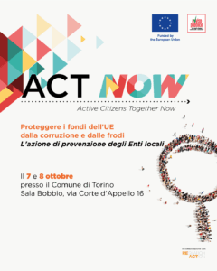 Si svolgeranno a Torino, il 7 e 8 ottobre, le prime due giornate formative del progetto ACT NOW – Active Citizens Together Now, finanziato dall’Unione Europea, in particolare dall’Ufficio europeo per la lotta Antifrode (OLAF), e realizzato da Avviso Pubblico in collaborazione con il centro di ricerca RE-ACT.