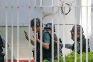 Police arrest Myanmar Now journalist Kay Zon Nwe in Yangon, Myanmar, on February 27, 2021, as protesters were taking part in a demonstration against the military coup. (AFP/Ye Aung Thu)