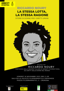 Venerdì 18 novembre 2022 alle ore 21 presso la sala della Società Filodrammatica Cremonese a Cremona il Gruppo 288 Amnesty International organizza l’evento: dialogo con Riccardo Noury, portavoce della sezione italiana di Amnesty International, sui diritti delle donne nel mondo