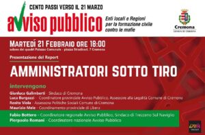 Promossa dal Comune di Cremona, in collaborazione con Avviso Pubblico – Enti locali e Regioni per la formazione civile contro le mafie, e con il Coordinamento provinciale di Libera, martedì 21 febbraio, alle ore 18:00, nella Sala dei Quadri di Palazzo Comunale (ingresso da piazza Stradivari, 7), si terrà la presentazione del report Amministratori sotto tiro.