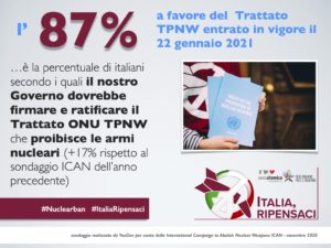 La rilevazione statistica (condotta da YouGov su un campione di oltre 1.000 persone nel novembre 2020) ha riscontrato come l’87% degli italiani sia favorevole all’adesione dell’Italia al TPNW (+17% rispetto ad un sondaggio simile del 2019) mentre l’attuale posizione del Governo contro il Trattato sia sostenuta solo dal 5%. Anche dopo esser stati informati delle forti pressioni da parte di alcuni alleati NATO contro il TPNW, il 76% ha confermato di volere un Governo che mostri una leadership positiva diventando uno dei prossimi aderenti.