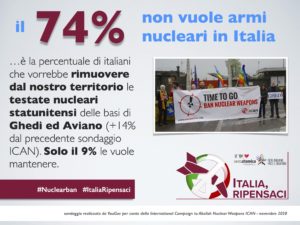 Sondaggi simili sono stati condotti in Belgio, Danimarca, Paesi Bassi, Islanda e Spagna con dimostrazione di sostegno al TPNW vicino o superiore all’80%. La NATO ha un impegno dichiarato a sostenere il disarmo nucleare, ma si è opposta ad ogni passo per giungere al Trattato TPWN e recentemente ha rinnovato il suo impegno a rimanere un’alleanza nucleare. Gli Stati Uniti, la Francia e il Regno Unito stanno attualmente spendendo migliaia di miliardi di dollari per sviluppare nuove armi nucleari destinate a durare per decenni, alcune delle quali (le B61-12) verranno anche dispiegate nelle basi italiane di Aviano e Ghedi.