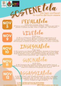 Domenica 12 novembre, infine, ultimo appuntamento con “AssaggiaTELA”. Alle 12 è in programma un pranzo con un menù realizzato principalmente con i prodotti di aziende che lavorano su terreni confiscati, con la possibilità di chiacchierate dal vivo e online con i protagonisti.