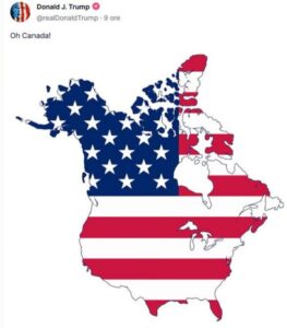 Il presidente eletto americano Donald Trump ha pubblicato su Truth una mappa in cui il Canada fa parte degli Stati Uniti, ribadendo le mire espansionistiche rilanciate più volte negli ultimi giorni nei confronti del vicino, così come della Groenlandia e del Canale di Panama. La foto, con i colori della bandiera a stelle e strisce che ricoprono i due Paesi uniti, è accompagnata dalla didascalia “Oh Canada!”. L’Europa trema, la Commissione tace.