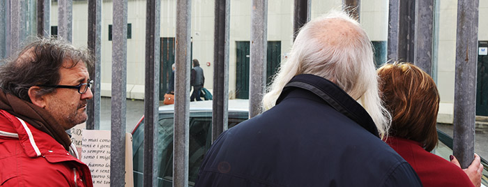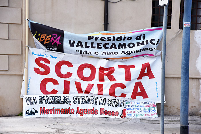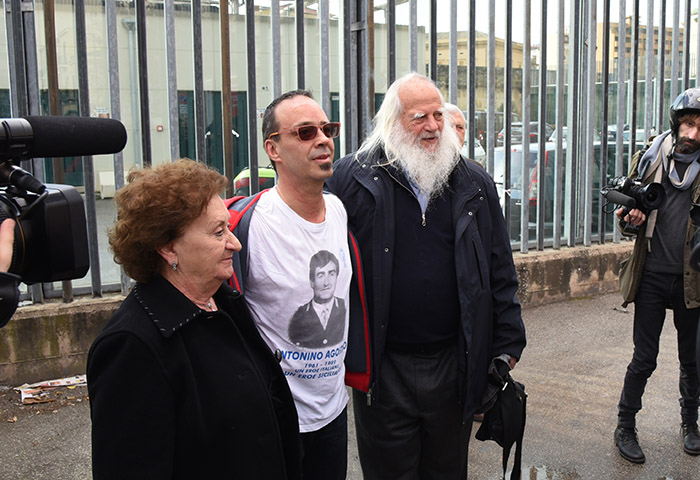 All’ingresso dell’aula bunker si ritrovano per sostenere la famiglia Agostino tanti amici, conoscenti e cittadini in rappresentanza delle Agende rosse, Scorta civica e Libera. C’è anche il sindaco di Palermo Leoluca Orlando, venuto a portare il saluto e il ringraziamento della città ad un suo concittadino così impegnato da anni nella ricerca di verità e giustizia.