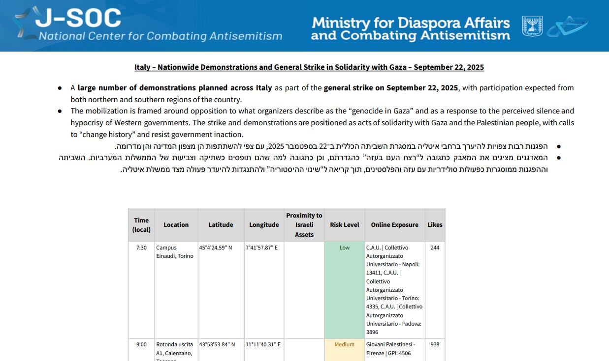 Scopriamo con sconcerto che, in un report sul sito Ministry for Diaspora Affairs and Combating Antisemitism del Governo Israeliano pubblicato alla vigilia dello Sciopero Generale contro il genocidio a Gaza del 22 settembre 2025, il J-Soc (Centro Nazionale per Combattere l’Antisemitismo) aveva schedato ogni singola manifestazione, raduno e presidio con orari, luogo e addirittura coordinate geografiche e coefficiente di rischio, indicandone gli organizzatori e il numero di partecipanti previsti in base alle interazioni sul web.