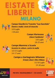 - Campo per singoli a Milano – Giardini in transito (5-8 luglio) – 15 posti disponibili Campo non residenziale rivolto a partecipanti sopra i 18 anni. Il campo al Giardino Comunitario Lea Garofalo si propone di affrontare i temi dell’impegno associativo di Libera. In particolare, dedicando occasioni alla conoscenza della storia di Lea Garofalo, approfondendo la figura della donna nelle organizzazioni criminali e il ruolo della memoria come strumento di contrasto ai fenomeni mafiosi. Si potrà incontrare la rete associativa impegnata nel quartiere e assistere alla testimonianza di un familiare di vittima di mafia.