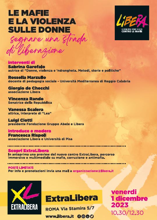 In occasione delle iniziative realizzate nell’ambito della Giornata Internazionale contro la violenza sulle donne, Libera propone un incontro di approfondimento il 1 dicembre 2023, presso la nuova sede Extralibera, in via Stamira 5/7, dal titolo “Le mafie e la violenza sulle donne. Segnare una strada di liberazione” (ore 10.30-12.30).