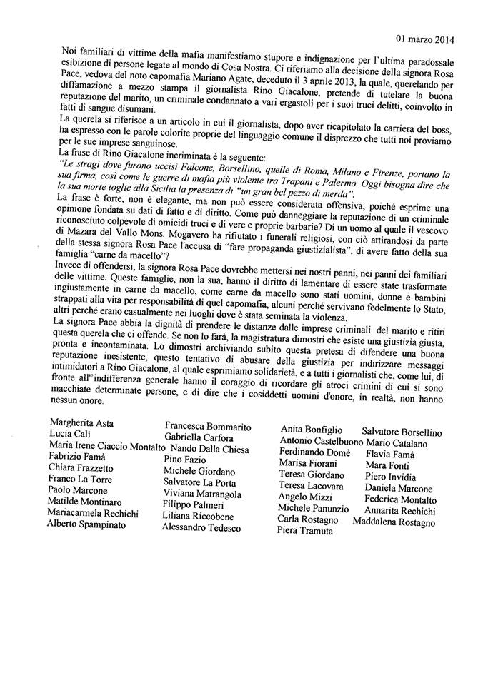 “Noi familiari di vittime delle mafie manifestiamo stupore e indignazione per l’ultima paradossale esibizione di persone legate al mondo di Cosa nostra. Ci riferiamo alla decisione della signora Rosa Pace, vedova del noto capomafia Mariano Agate, deceduto il 3 aprile del 2013, la quale querelando per diffamazione a mezzo stampa il giornalista Rino Giacalone, pretende di tutelare la buona reputazione del marito, un criminale condannato per i suoi truci delitti, coinvolto in fatti di sangue disumani”. Con queste parole ha inizio la lettera che circa quaranta familiari di vittime delle mafie hanno pubblicato per esprimere pubblico sostegno al giornalista trapanese Rino Giacalone reo – secondo la vedova del boss Agate – di aver leso il buon nome del marito attraverso una frase contenuta in un articolo, pubblicato in corrispondenza della morte del capomafia trapanese.