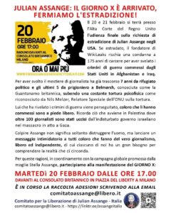 Il DAY X fissato dall’Alta corte di Londra per il 20-21 febbraio 2024, vi sarà il pronunciamento in merito all’ultimo appello di cui Julian Assange dispone. Se questo dovesse essere respinto, Assange potrebbe essere estradato immediatamente negli Stati Uniti dove lo attende un processo già scritto in cui non potrebbe difendersi.
