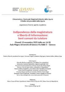 Magistrati, docenti universitari e giornalisti sono i protagonisti di un dibattito organizzato dall’ANM Liguria e dall’Ordine dei giornalisti ligure, dal titolo “Indipendenza della magistratura e libertà di informazione: beni comuni da tutelare”. Il convegno si terrà il 13 novembre all’Università di Genova, con i saluti di Federico Manotti, presidente dell’ANM Liguria, Tommaso Fregatti, presidente dell’Ordine dei giornalisti della Liguria, e Federico Delfino, rettore dell’Università di Genova.