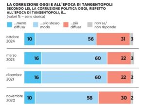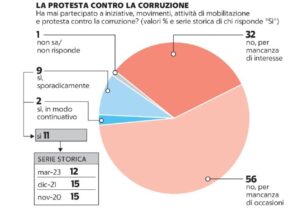 Il 56% degli intervistati afferma che la corruzione non si è ridimensionata rispetto al periodo di Tangentopoli, mentre il 31% ritiene che essa sia addirittura aumentata. Solo il 10% pensa che la corruzione sia diminuita.