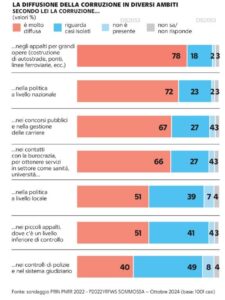 La corruzione, infatti, viene percepita come un fenomeno ampiamente diffuso in vari settori, a partire dai grandi appalti pubblici, dove quasi 8 intervistati su 10 ritengono che il fenomeno sia molto radicato. Un altro ambito in cui la corruzione appare “quasi una necessità” per due terzi degli intervistati è quello dei concorsi pubblici e della gestione delle carriere.