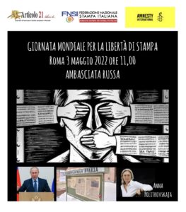 In occasione della Giornata mondiale della libertà di stampa 2022 che si celebra, come ogni anno, il 3 maggio, la Federazione nazionale della Stampa italiana, Amnesty International Italia e l’associazione Articolo21 promuovo un sit-in alle 11, nei pressi dell’Ambasciata della Federazione Russa, a Roma, per protestare contro l’invasione dell’Ucraina e il bavaglio imposto ai media indipendenti russi e bielorussi.