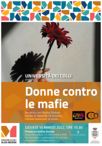 Giovedì 10 Marzo ore 15,30, in occasione della Giornata Internazionale della Donna, avremo il grande piacere di ospitare l’Associazione Libera di Mantova nelle persone del Presidente Azzolino Ronconi e della coordinatrice Maria Regina Brun che accompagneranno la Signora Marisa Fiorani madre di Marcella Di Levrano vittima innocente di mafia.
