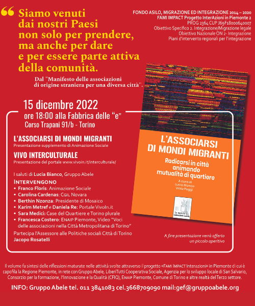 “Siamo venuti dai nostri Paesi per essere parte della comunità che ci accoglie” sono le parole iniziali del Manifesto delle associazioni di origine straniera a Torino, scritto da tante realtà del territorio. Il Manifesto è all’interno della pubblicazione “L’associarsi dei mondi migranti” che presenteremo al Gruppo Abele giovedì 16 dicembre.